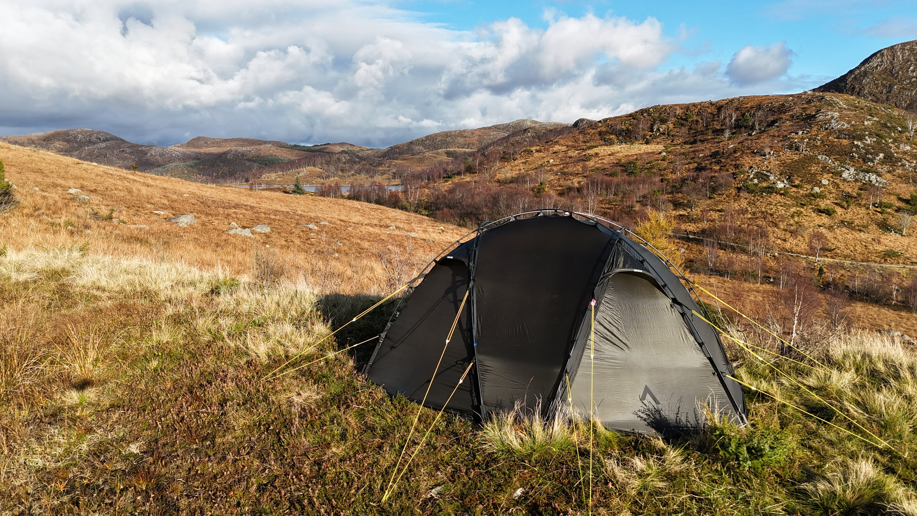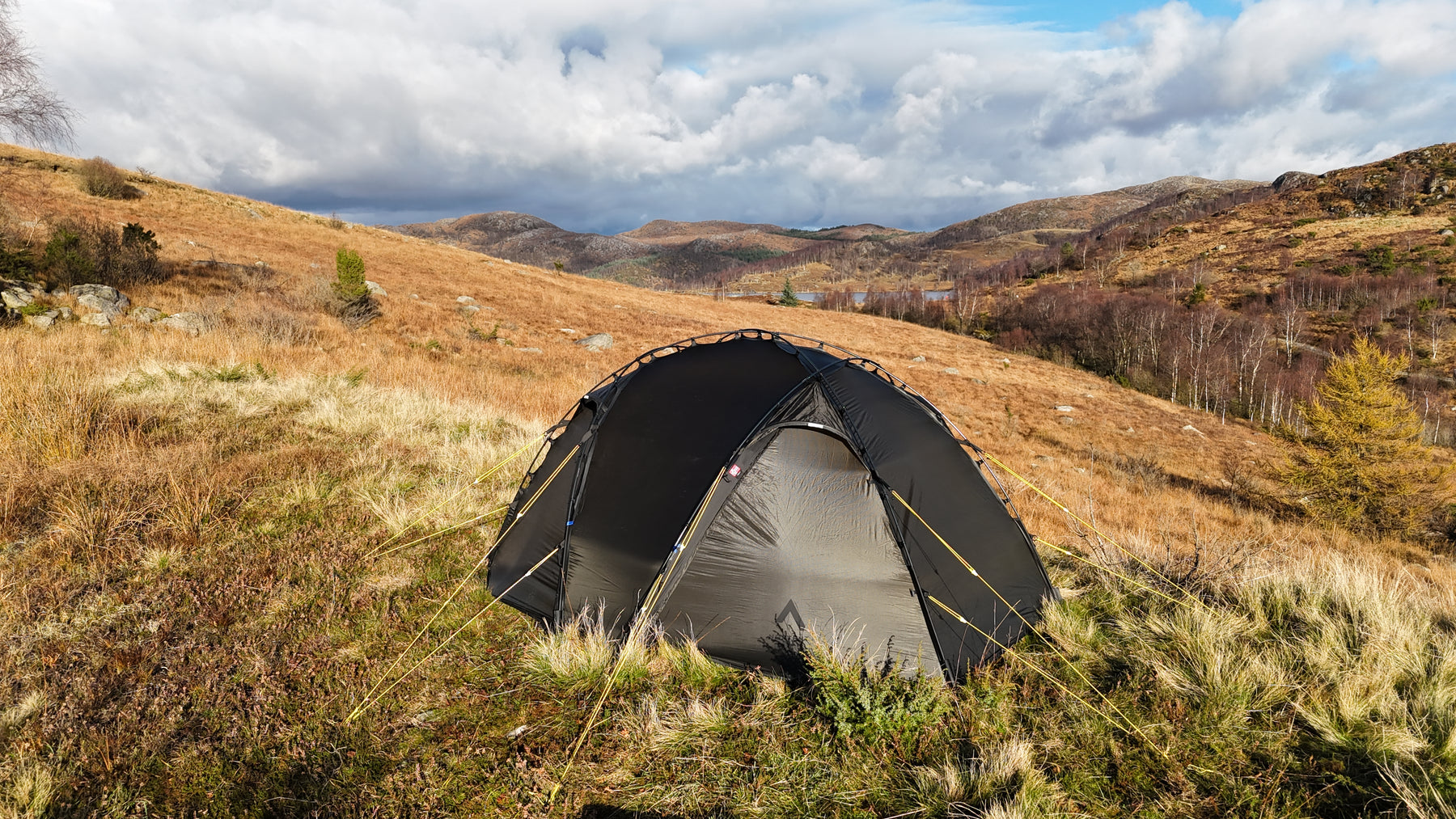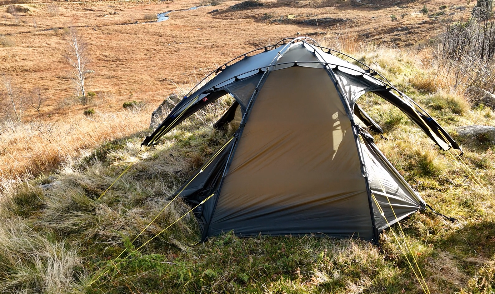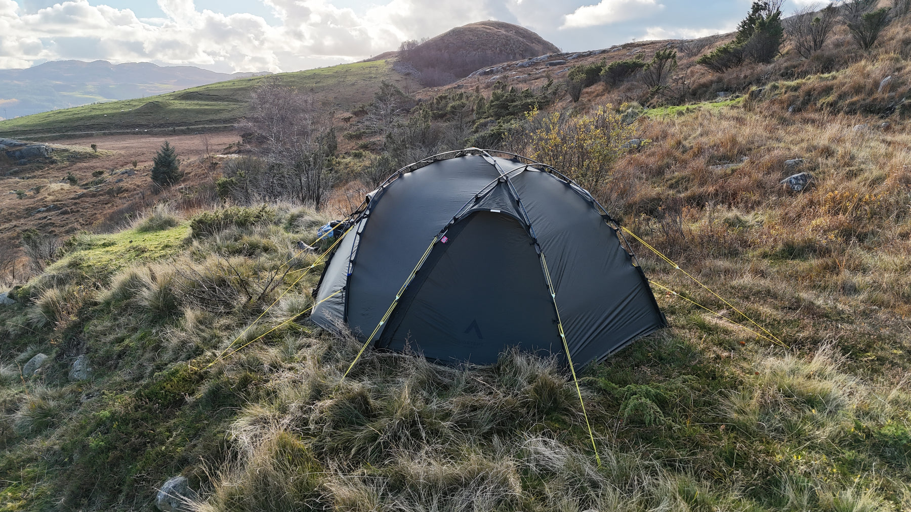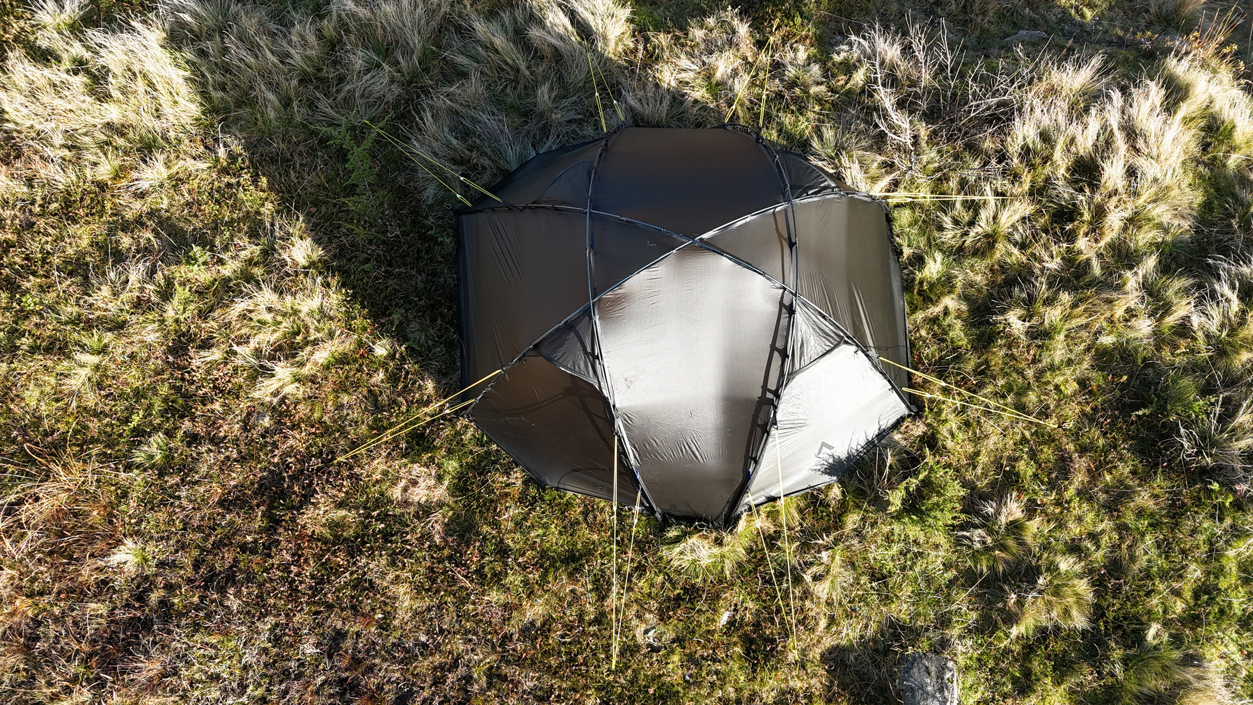 Silhuetten er ren, gjennomtenkt og naturlig i landskapet, samtidig som den etterlater minimale spor. Oppsettet er raskt og intuitivt. Med litt øvelse har du et trygt og solid leirsted på 5–6 minutter, klart for varme og hvile etter en lang dag ute.