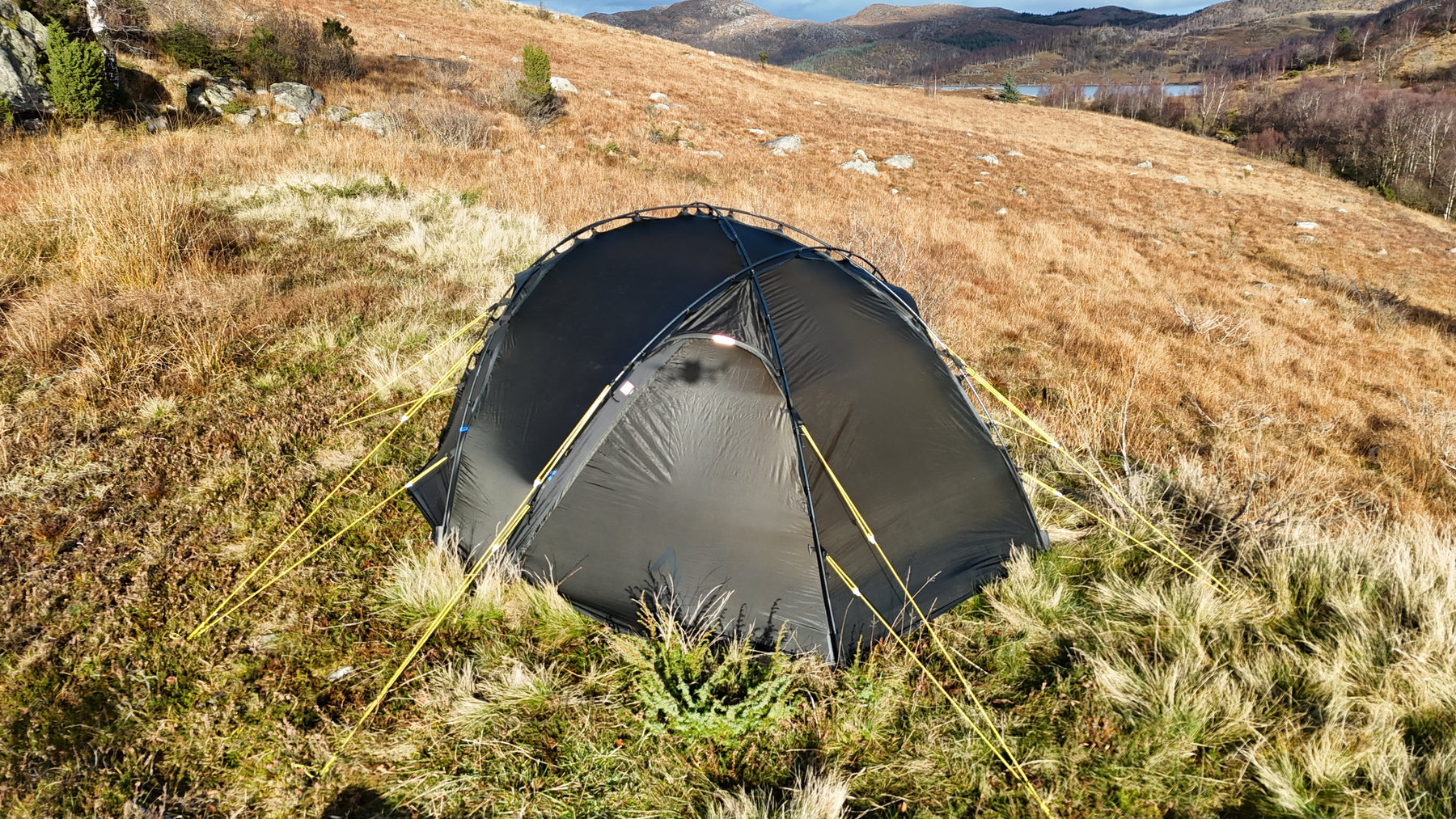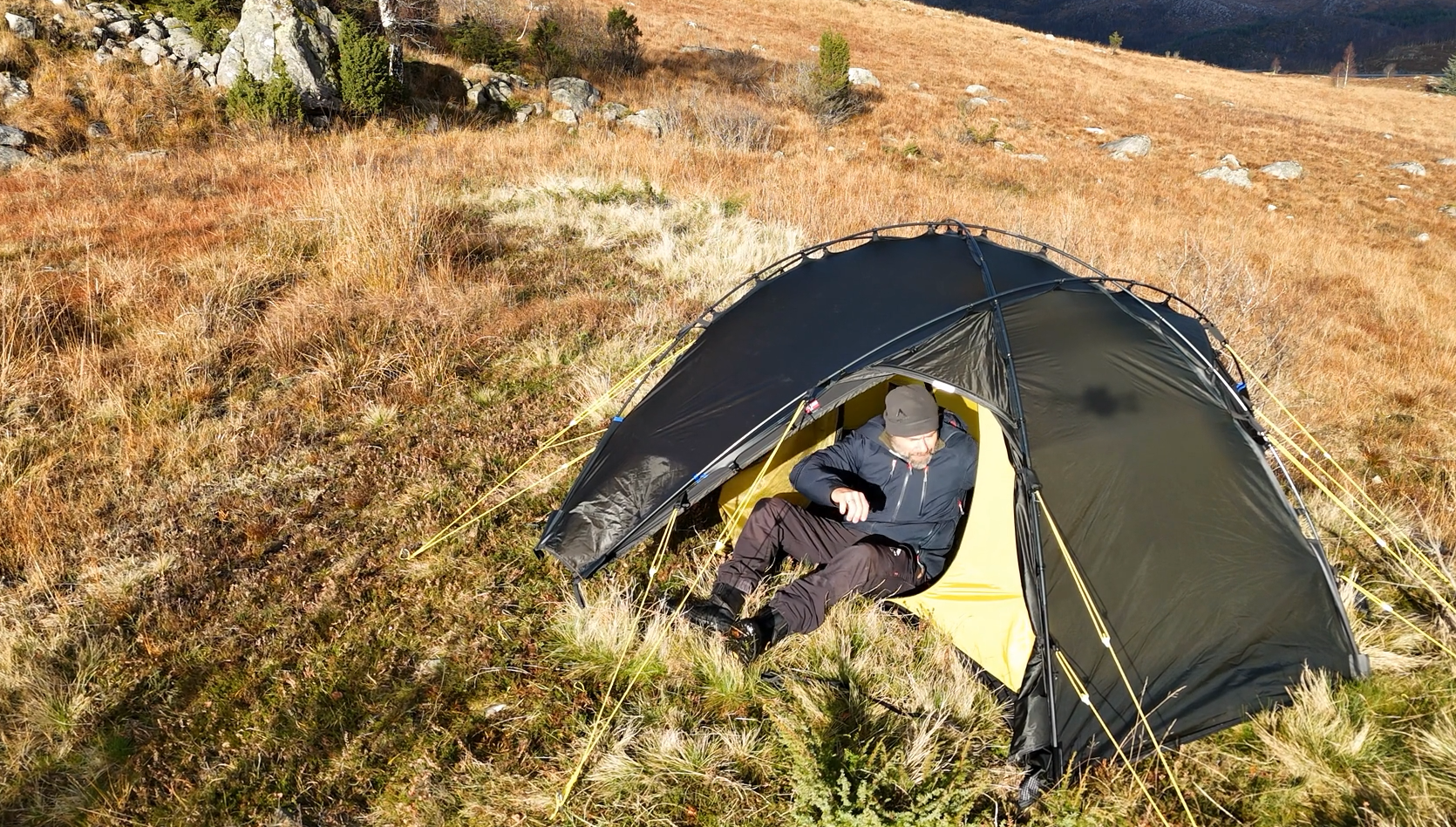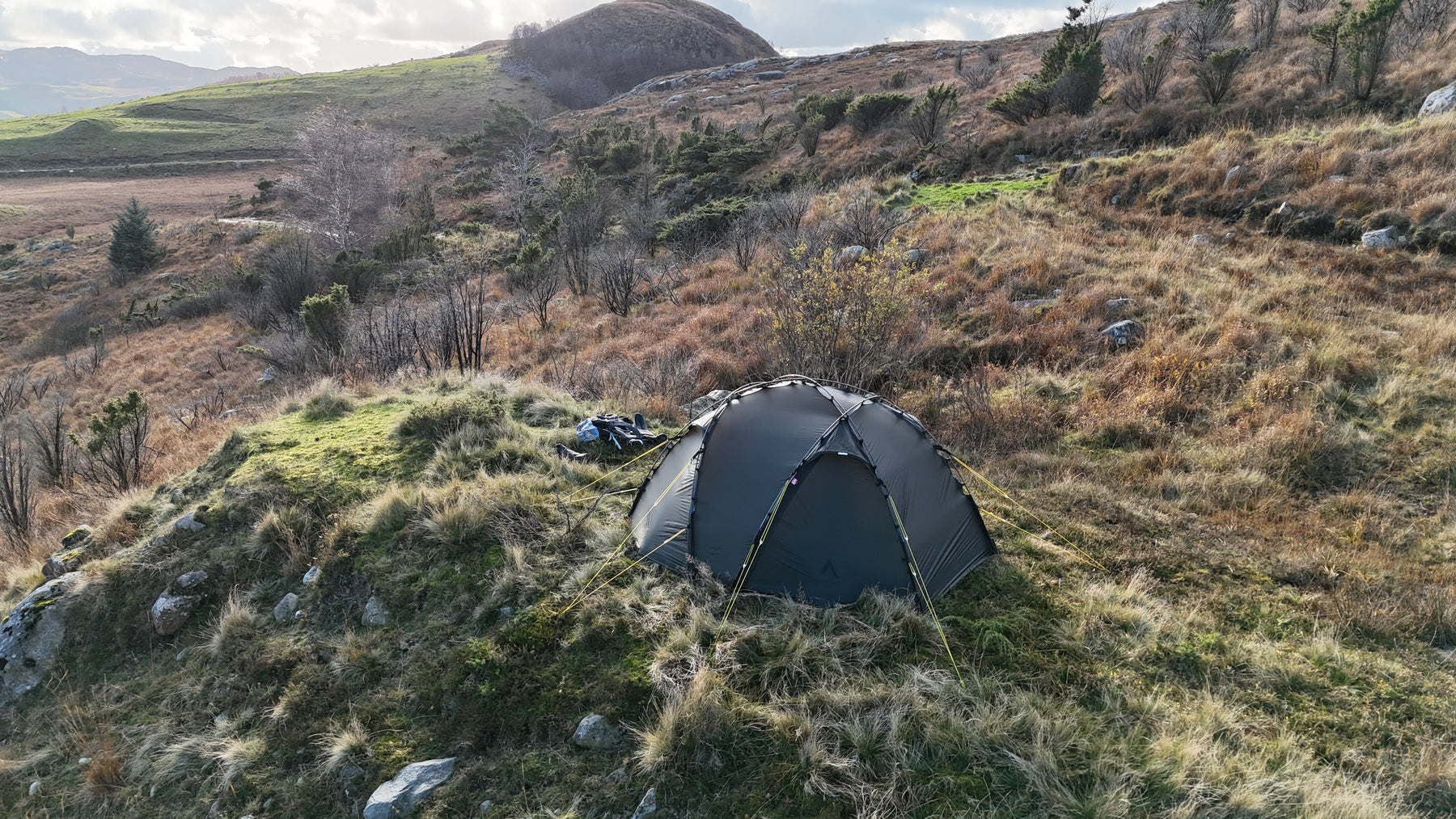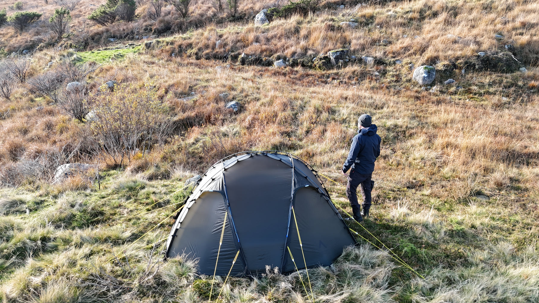 Silhuetten er ren, gjennomtenkt og naturlig i landskapet, samtidig som den etterlater minimale spor. Oppsettet er raskt og intuitivt. Med litt øvelse har du et trygt og solid leirsted på 5–6 minutter, klart for varme og hvile etter en lang dag ute.