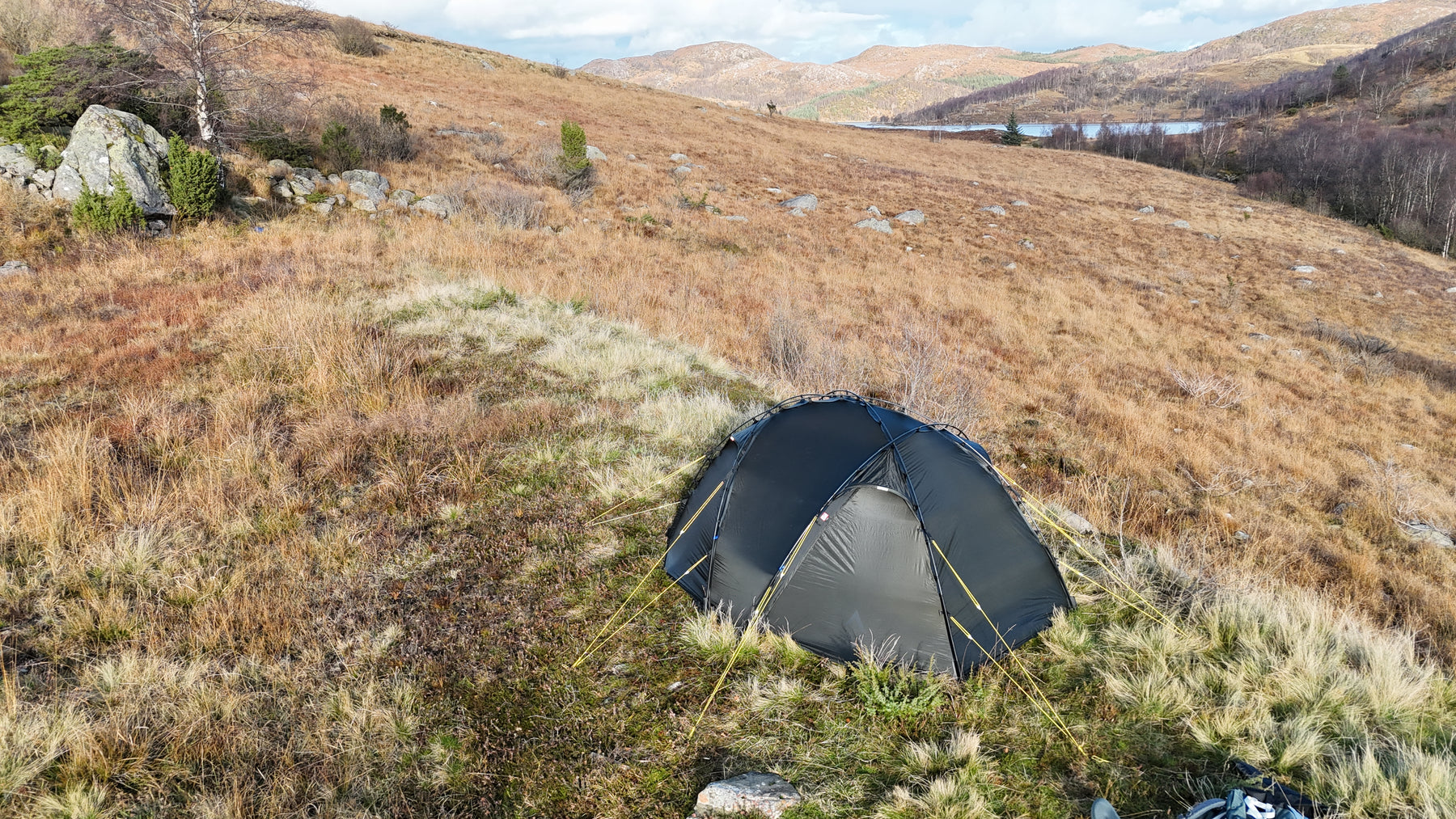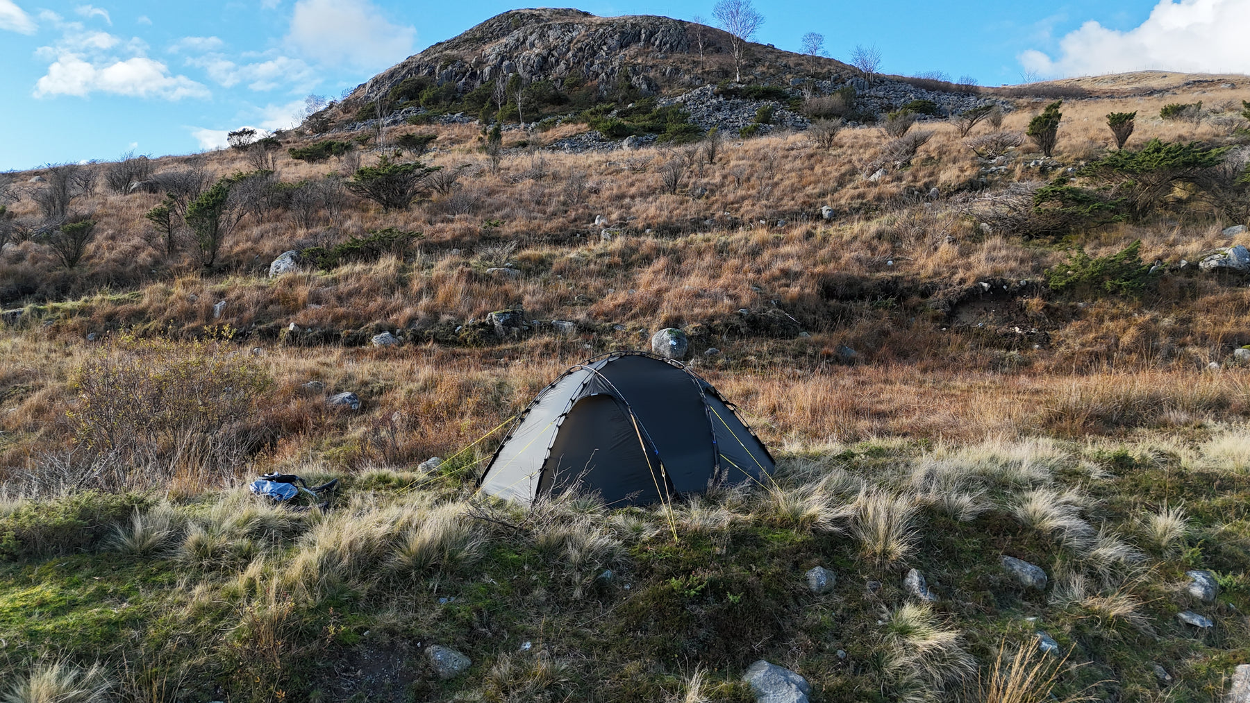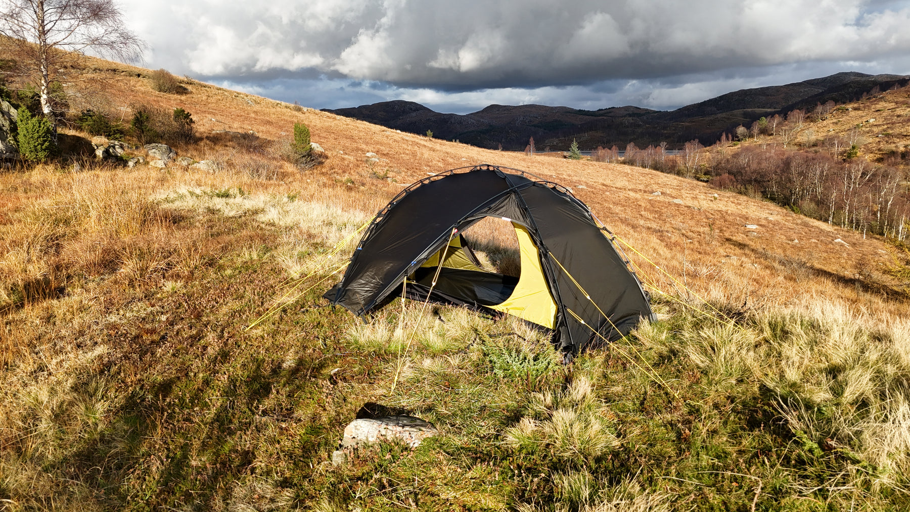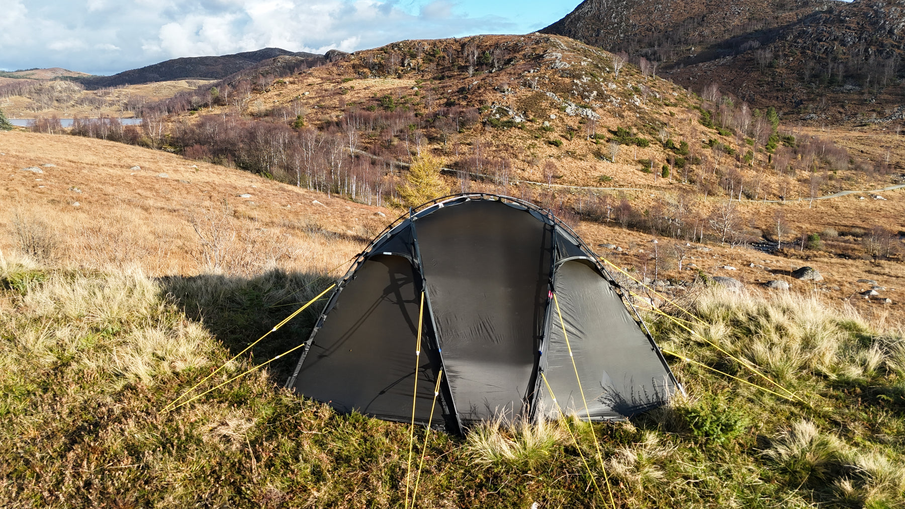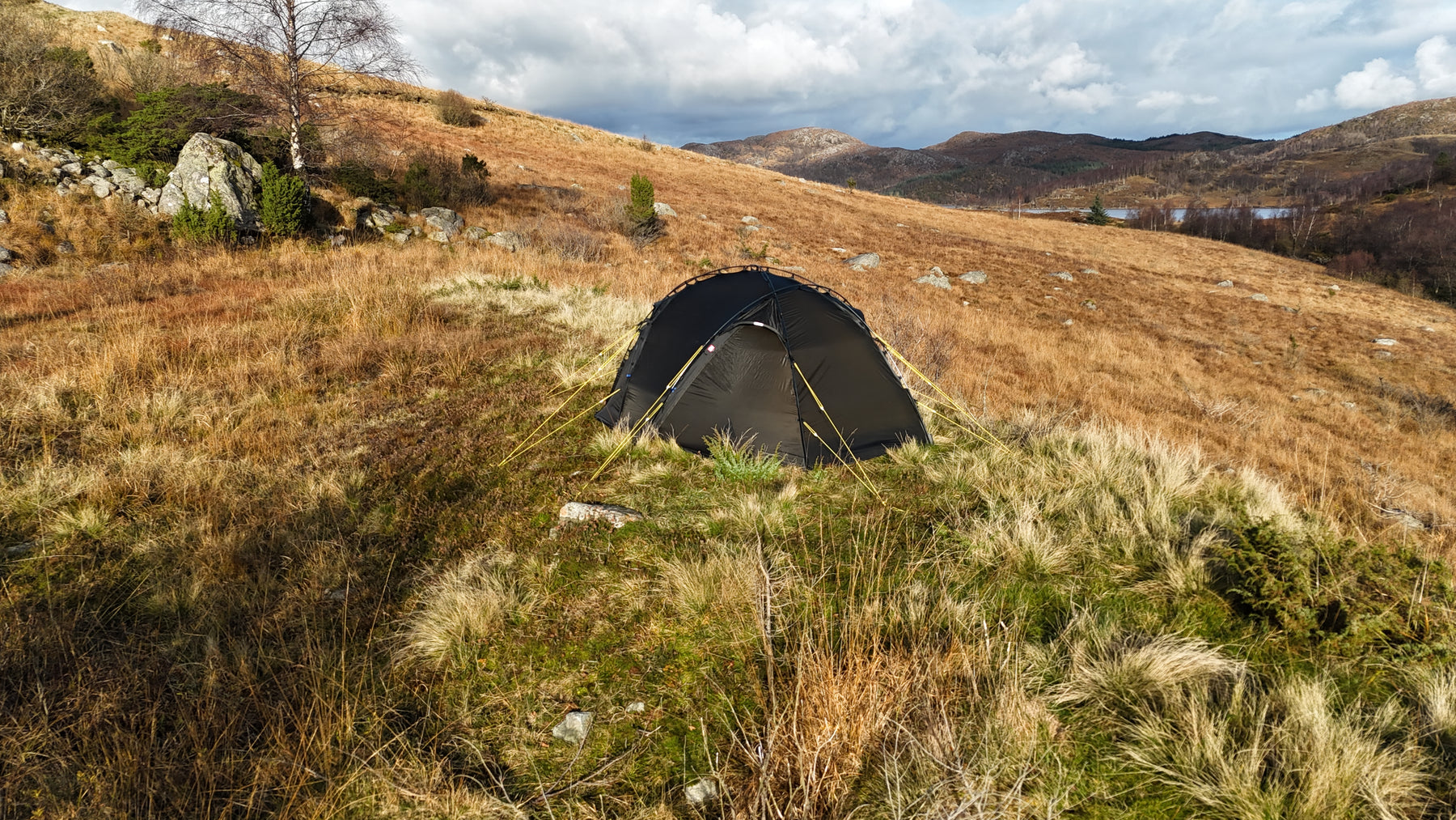 Silhuetten er ren, gjennomtenkt og naturlig i landskapet, samtidig som den etterlater minimale spor. Oppsettet er raskt og intuitivt. Med litt øvelse har du et trygt og solid leirsted på 5–6 minutter, klart for varme og hvile etter en lang dag ute.